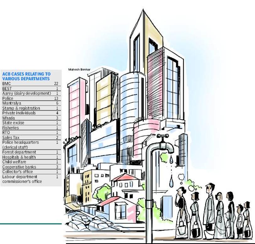 The ACB registered a total of 65 cases in 2011, of which 22 were related to the civic body and 13 to the Mumbai police. The third worst was Mantralaya with six cases, following which were several government departments or bodies with graft cases in the range of one to four.
