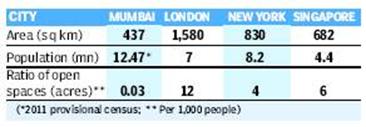 Mumbai has an abysmal paucity of gardens and playgrounds, leaving the city of 12.47 million gasping.The appalling ratio of 0.03 acres of open space for every 1,000 persons is a far cry from London’s 12 acres, New York’s four acres and Singapore’s six acres per 1,000 people.