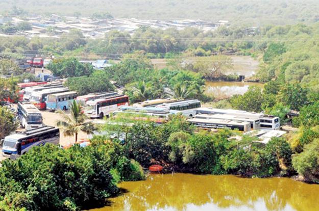 Destruction uninterrupted: The illegal construction and parking of private vehicles and tourist buses have taken a toll on the green cover along the Borivli-Dahisar Link Road. Pics/Nimesh Dave