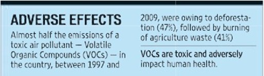 Almost half the emissions of a toxic air pollutant — Volatile Organic Compounds (VOCs) — in the country, between 1997 and 2009, were owing to deforestation (47%), followed by burning of agriculture waste (41%). This was revealed by an analysis of emissions from biomass burning in rural areas by Ahmedabad-based Physical Research Laboratory (PRL), who were supported by the Department of Space, and FIT Engineering College, Meerut.