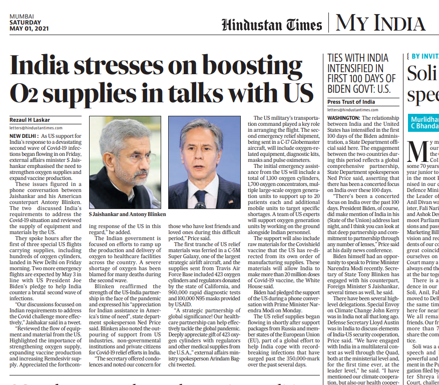 As this goes on, talks at the higest level are going on between India and the US to improve the Oxygen situation.