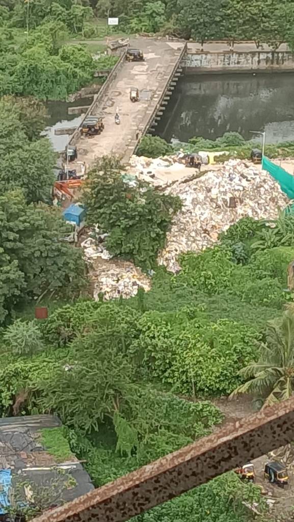 An unauthorized dumping ground has developed adjacent to Viceroy Park society in Kandarpada, Dahisar West in July 2025.