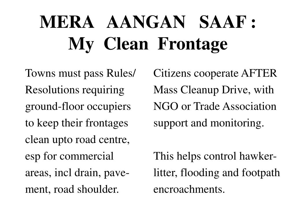 “Saaf Aangan” is a citizen-led initiative, often associated with Mumbai’s Mera Aangan Saaf movement and formalized through the city’s byelaws, encouraging residents to take responsibility for maintaining the cleanliness of the space in front of their properties, including footpaths and roads. This concept involves property owners and residents adopting and cleaning their “aangan” (courtyard or immediate surrounding) to keep it free of garbage, and fostering a culture of cleanliness that extends beyond personal spaces to benefit the entire community and city.